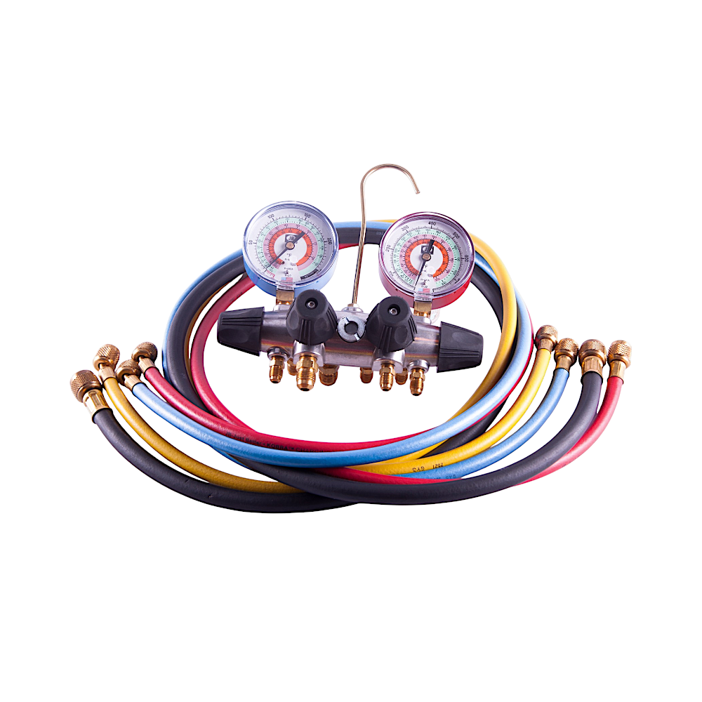 O manifold possui manôplas plásticas e um corpo em latão, garantindo durabilidade e resistência. O sistema de vedação com duplo O-ring assegura conexões seguras e confiáveis durante o processo de evacuação e carga de refrigerantes. Acompanha mangueiras de 150 cm de alta qualidade, prontas para uso imediato.