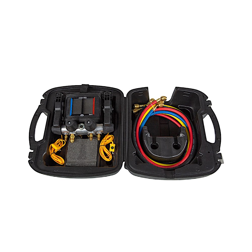 Este manifold digital é equipado com sensores de sobreaquecimento e sub-resfriamento, otimizando o processo de manutenção e evitando falhas no sistema. A mangueira de vácuo de 3/8” permite uma evacuação eficiente, enquanto o sistema de vedação com duplo O-ring assegura conexões seguras. O kit inclui 4 mangueiras de alta qualidade, além de uma resistente maleta de transporte e pilhas, garantindo praticidade e durabilidade no uso.