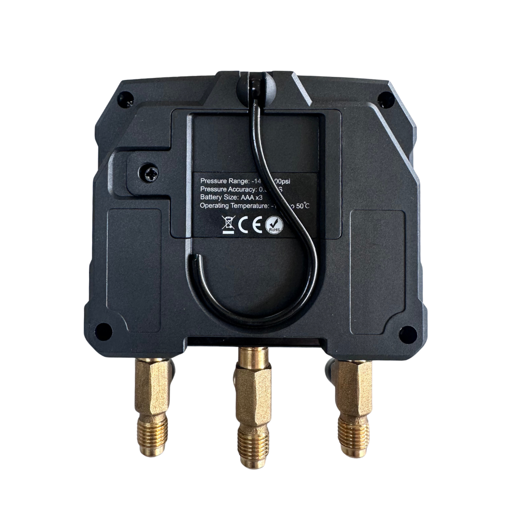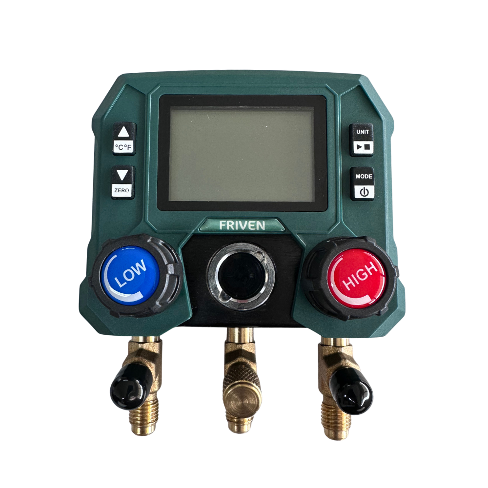 O Manifold Digital Friven é indicado para medição de pressão, temperatura e vácuo em sistemas de refrigeração e ar condicionado. Compatível com 88 fluidos refrigerantes, incluindo R32 e R1234yf, permite a visualização das temperaturas de evaporação e condensação de cada gás.