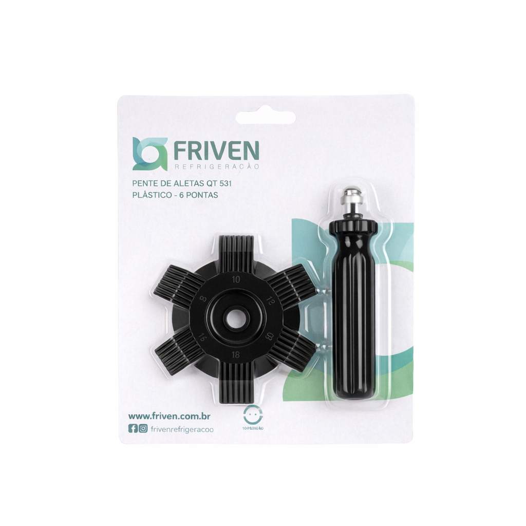 O Pente de Aletas 6 Pontas Plástico CT 351 Friven é a solução prática para profissionais da refrigeração que buscam otimizar o desempenho de serpentinas e radiadores, ajustando o alinhamento das aletas de forma eficiente. Com seis pontas de espaçamentos diferentes, ele realinha as aletas de forma homogênea, assegurando um fluxo de ar eficiente.